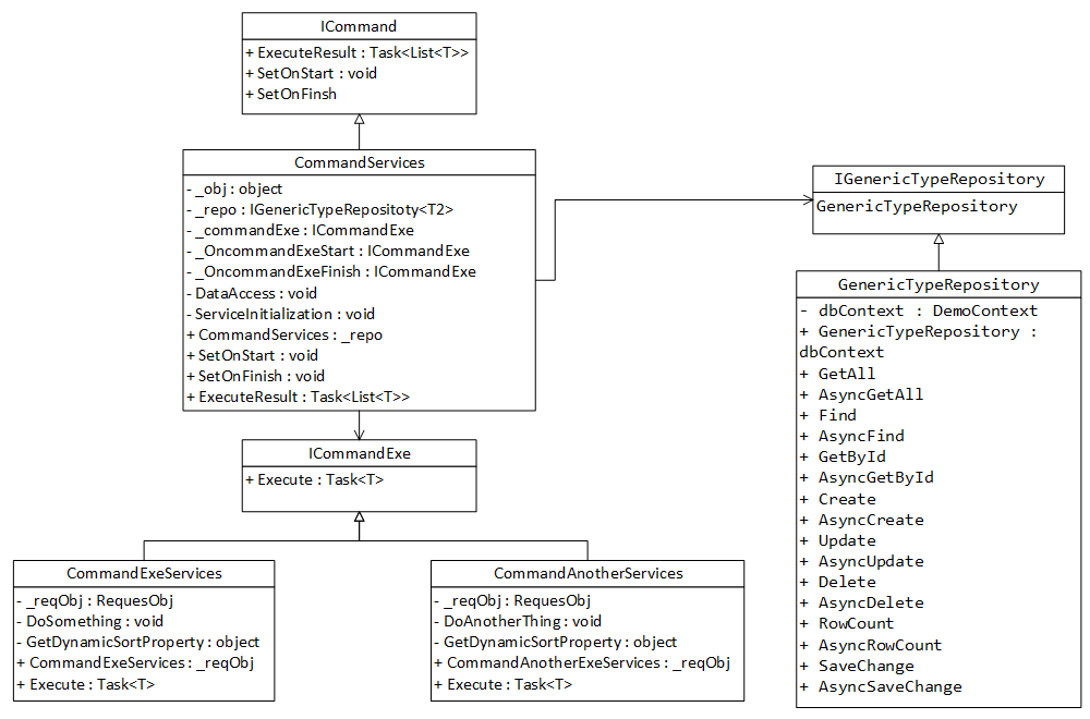 } Step 3 The service part files let us start from the CommandService class file to edit. The CommandService class file must inherit the ICommand interface class, then add the IGenericTypeRepository interface class by DI mechanism and a few variables and functions. Suppose the data has been accessed before the command pattern operations. The command service class file can focus on the command pattern concept to edit. Remember that the ICommand interface class file has the “in” and “out” operator mechanism, so the developers must be careful to edit it.