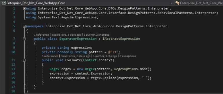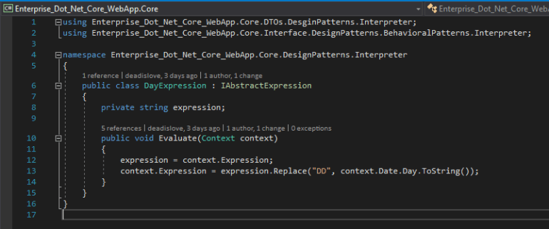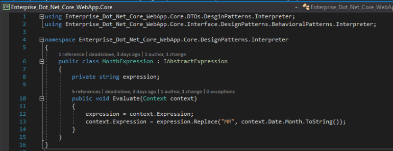 Step 1 Create the interpreter pattern interface class files and the interpreter pattern-related interface class files in the Core project. One interface class file name sets “IInterpreter.” Other interface class file name sets “IAbstractExpression.”
