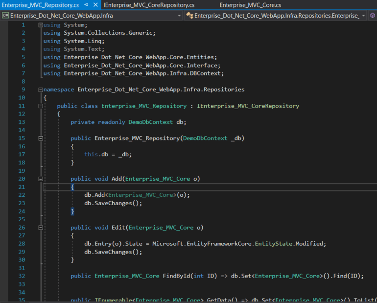 Step 13. Edit some codes in the Enterprise_MVC_Repository file. This code will accord the interface file of the core project to create the methods in this file. The infra project is based on Microsoft.EntityFrameworkCore library, so you write code that must follow the Microsoft.EntityFrameworkCore rules.